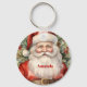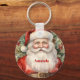 Um chaveiro com uma imagem de aquarela de estilo de vintage fofo. Papai Noel de terno vermelho com bochechas alegres e um rosto sorridente. Cercado por pinheiro e sagrado.