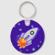 Um foguete de cartoon brilhante atravessando o espaço com estrelas no fundo