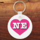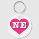 Este chaveiro apresenta um coração rosa-quente vibrante contendo as letras maiúsculas, brancas e em negrito NE, a abreviação oficial para Nebraska, o estado do película.