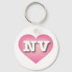 Este chaveiro apresenta um coração calmo, legal e colecionado cor-de-rosa com um centro branco lavado contendo as letras maiúsculas e em negrito NV, a abreviação oficial de Nevada, o estado prateado.