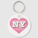 Este chaveiro apresenta um coração cor-de-rosa com um centro lavado em branco contendo as letras maiúsculas, brancas e em negrito NY, a abreviação oficial de Nova York, o estado do império.