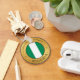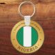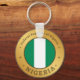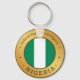 The national flag of Nigeria is encapsulated in a faux gold ring shape. Around the outer of the ring, are two parts of text with the official name of Nigeria and the country name.