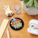 Meditando Buda pacificamente se senta entre um conjunto colorido de estrelas, arco-íris, flores e símbolos Yin Yang! Uma explosão de coloração e de consciência! Olhos pegando presentes de Buda!