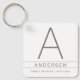 Chaveiros personalizados para a Reunião Familiar Favorecidos com um grande nome inicial, nome familiar e data de reunião em uma simples e moderna design em cinza e branco.