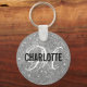 Chaveiro de brilho prateado com um monograma de escrita branca e um nome de tipografia preta. Personalize com seu nome e inicial.
