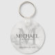 Adicione um toque pessoal ao seu casamento com padrinho de casamento personalizado. Este chaveiro apresenta o nome de padrinho de casamento personalizado com título e data de casamento em cinzas e monograma em cinza clara como fundo, no estilo clássico da serifa, em fundo de mármore branco. Também perfeito para o melhor homem, pai da noiva, porta-voz e muito mais. Observe que os detalhes do mármore são simulados no trabalho de arte. Não será utilizado nenhum mármore real no fazer deste produto.