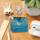 Um elegante design moderno. Em um fundo geode azul com muitas nuances de azul, há uma grande inicial de monograma branco, com o nome embaixo, também em bonés brancos. O geode azul é de uma foto de Robert Ramsay, do Pixabay, e é gratuito para uso comercial.