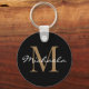Crie o seu próprio chaveiro preto redondo personalizado com o seu nome de script e monograma manuscrito de vidro personalizado.