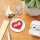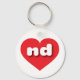 Este chaveiro apresenta um coração vermelho vibrante contendo as letras maiúsculas, brancas, arredondadas e em negrito, e uma abreviação lúdica para o estado de Dakota do Norte.