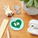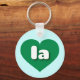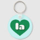 Este chaveiro apresenta um coração verde vibrante contendo as letras maiúsculas brancas, em negrito, arredondadas, la, uma versão lúdica da abreviação para Louisiana, o estado pelicano ou Los Angeles, a cidade de anjos.