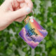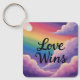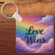 Este chaveiro apresenta uma impressão caprichosa de tinta a óleo de uma paisagem de nuvens de arco-íris sonhadora com a mensagem de lembrete de que o Amor Vence em uma escrita cursiva delicada.