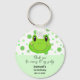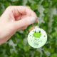 Festa de aniversário sapo Obrigado chaveiro. Cartoon verde sorridente de sapo em um fundo confetti. Esta chaveiro é projetada para ser usada como presente de favorecimento para convidado para festa de aniversário infantil, personalize o nome, a mensagem, o aniversário e a data.