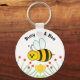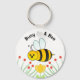 Uma abelha amarela e preta com as palavras Busy As A Bee no texto curvo acima. Abaixo estão flores amarelas, vermelhas e verdes.