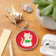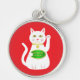 Este chaveiro de diversão apresenta uma imagem gráfica de design de um gato oriental de ondas brancas, sortudo. O gato tem belos olhos de ouro e está vestindo um medalhão de ouro no colarinho ao redor do pescoço. O gato tem orelhas rosadas e sussurros. Este gatinho bonitinho está segurando um token de ouro com uma entrada de jade verde e uma mensagem no texto de ouro que diz "Boa Sorte".