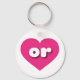 Este chaveiro apresenta um coração rosa-quente vibrante contendo as letras maiúsculas em negrito, branco, arredondadas ou, uma abreviação lúdica para Oregon, o estado do castor.