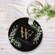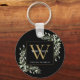 Elegante chaveiro de monograma com nome e folhas de folhagem em aquarela com um monograma inicial dourado em um fundo preto chique. Criado por Thisisnotme©