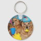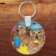 Esta chaveiro apresenta recuperadores de ouros na praia segurando uma pilha e uma pá em suas bocas.