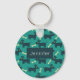 Um chaveiro personalizado desenhado com um padrão repetitivo que apresenta um sorriso fofo com orelhas disquetes e um osso de cão. Fundo verde.
