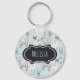 Chaveiro personalizado com um padrão fofo com lhamas brancas. Um está deitado, um está segurando uma flor na boca dele, e um está olhando para você desconfiadamente. Estes animais têm um grande caráter encantador. Colocado sobre um fundo de bolinhas verde. Camadas sobre o topo é um quadro de rico de vintage em preto-e-branco com seu dentro de texto.
