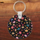 Uma variedade vibrante de flores e folhas coloridas está espalhada sobre um fundo preto, criando um padrão impressionante e vivo. Diferentes formas e tamanhos de flores em rosa, amarelo, laranja e azul adicionam uma sensação divertida e alegre.