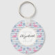 Uma corrente chave com um padrão com uma vibração de verão divertida. flamingos e abacaxis cor-de-rosa, colocados sobre um padrão listrado azul claro com folhas e corações ao redor.