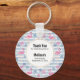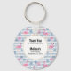 Um partido favorece a cadeia de chaves com um padrão com uma vibração de verão divertida. flamingos e abacaxis cor-de-rosa, colocados sobre um padrão listrado azul claro com folhas e corações ao redor.