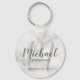 Adicione um toque pessoal ao seu casamento com padrinho de casamento personalizado. Este chaveiro apresenta o nome personalizado dos padrinhos de casamento no estilo de fonte e monograma do script moderno da cinza em estilo de fonte moderno do roteiro da cinza leve como fundo com título e data de casamento em estilo de fonte sans modernos da cinza em fundo branco mármore. Também perfeito para o melhor homem, pai da noiva e mais. Observe que os detalhes do mármore são simulados no trabalho de arte. Não será utilizado nenhum mármore real no fazer deste produto.