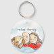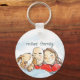 Esta chaveiro tem uma ilustração de um filhote fofo e seus pais, um homem careca e uma mulher morena. Você pode personalizar o texto.