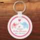 Padrão de listras cor-de-rosa e brancas diagonais no fundo com três elefantes bonitos, o pai em azul, a mãe em rosa com uma flor branca na cabeça e a menina na rosa claro. Ideal para presentes de chá de fraldas ou nascimento.