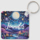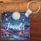 Chaveiro personalizado com uma bela ilustração. Vírus caprichoso e fantasioso. Uma lua grande brilhando com estrelas ao redor. Passando por uma bela paisagem de árvores, montanhas e um rio sinuoso. Incrível vibração mística mágica.