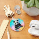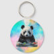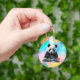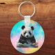 Um panda olha curiosamente para um grupo de peixes coloridos nadando na frente dele. O peixe vibrante contrasta com o pelo monocromático do panda, criando uma cena de chamas.
