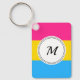 Keychain with the pansexuality pride flag with rainbow stripes of pink, yellow, and blue, pan pride design with a custom text field for your initial