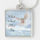 Grande chaveiro de metal de alta qualidade quadrada com uma imagem de uma pomba branca num céu azul turvo e as palavras "White Bird must Fly" em escrita negra.