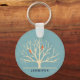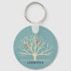 Uma chaveiro com um fundo verde mudo sobre a parte superior é uma árvore amarela clara com 2 silhuetas de pássaros laranja sentados nos galhos.