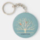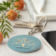 Uma chaveiro com um fundo verde mudo sobre a parte superior é uma árvore amarela clara com 2 silhuetas de pássaros laranja sentados nos galhos.