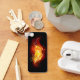 Pena de pavão brilhante feita de fogo e chamas sobre fundo negro.