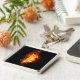 Pena de pavão brilhante feita de fogo e chamas sobre fundo negro.