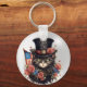 A dignified, long-haired cat gazes forward with calm authority, wearing a vintage top hat adorned with subtle celestial motifs, a red-and-white band, and a brass clock medallion. Soft red and blue roses frame the cat’s face, weaving through its fur in a patriotic floral wreath. A small American flag rises proudly at one side, blending national pride with Victorian elegance. The artwork combines whimsical Americana with refined, storybook charm, evoking both independence and timeless grace.