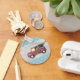 Uma chaveiro com uma imagem de um carrinho de brinquedo fofo com a mão Feliz de Natal pintada ao lado. Carregando uma árvore de Natal decorada nas costas. Texto diz: Paz Amor e Joy. Colocado em um padrão prateado. Flocos de neve ao fundo.