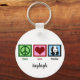 Um urso panda adorável em uma praça azul perto de um sinal verde de paz e um coração vermelho em um belo chaveiro animal. Eu adoro pandas bonitinhos.