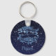 Chaveiro com o símbolo do zodíaco para Peixes em azul-prata suave, sobrepostos com as estrelas da constelação, contra um fundo do céu estrelado formando de azul-da-meia-noite a preto.