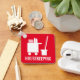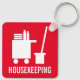 Chaveiro de limpeza de quartos de hotel para faxineiros ou zeladores. Adicione seu próprio texto personalizado e cores opcionalmente. Chaveiro personalizado para chaves em hotéis, motel, cama e café da manhã, negócios de hotelaria, hospedagem, conferência, casa, escritório, restaurante, companhia, escola etc. Cor vermelha e branca ou personalizada. Logótipo do agregado com carrinho de limpeza em roda, vassoura ou esfregona, balde, toalhas e garrafas.