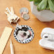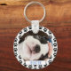 Chaveiro preto e branco personalizável que pode ser totalmente personalizado com o nome e a imagem do seu animal de estimação. Design de impressão monocromática moderna com texto azul. Um presente único ideal para o dono do animal de estimação na sua vida.
