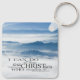 A chaveiro das escrituras de inspiração cristã retrata uma fotografia da natureza com montanhas azuis cobertas por uma nuvem embaçada. Ele apresenta a Bíblia Verse Philippians 4:13, "Eu posso fazer todas as coisas através do Cristo que me fortalece."