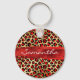 Folha vermelha, preta e dourada e mancha-leopardo preta com uma pincelada de folha de alumínio correspondente para o seu nome. Design de safari moderno para o seu aniversário. Corda-chave de vidro vermelho e ouro feminino.