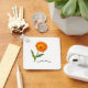 Flor laranja com gotas de chuva nas pétalas, caule e folhas verdes. Título "Calendula" aparece em texto curvo na parte inferior.