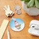 Um chaveiro com um design bonitinho e caprichoso com um adorável pinguim vestindo um chapéu de santa vermelho. Ficando atrás de um buquê de flores com canas doces listradas cor-de-rosa e branca. Um fundo de inverno nevado com flocos de neve caindo.