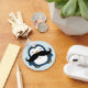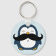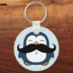 Um pinguim giro azul giro com um bigode preto enorme com uma imagem de fundo azul.