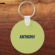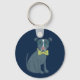 Este chaveiro personalizado apresenta uma ilustração de um belo filhote. Este cão-frade está a vestir um par de óculos coloridos e uma gravata de arco verde limão e está contra um fundo azul marinho. No verso está um ponto para adicionar um nome em letras marinhos azuis contra um fundo verde limão.