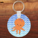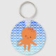 Um polvo de desenho laranja giro. Cadeias de animais bebês. Ondas azuis no fundo. Ideia de presente para crianças.